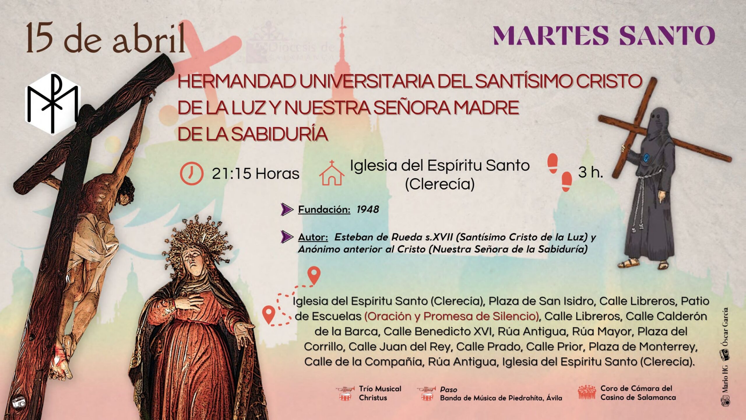 Recorrido: Iglesia del Espíritu Santo (Clerecía), Plaza de San Isidro, Calle Libreros, Patio de Escuelas (Oración y Promesa de Silencio), Calle Libreros, Calle Calderón de la Barca, Calle Benedicto XVI, Rúa Antigua, Rúa Mayor, Plaza del Corrillo, Calle Juan del Rey, Calle Prado, Calle Prior, Plaza de Monterrey, Calle de la Compañía, Rúa Antigua, Iglesia del Espíritu Santo (Clerecía).